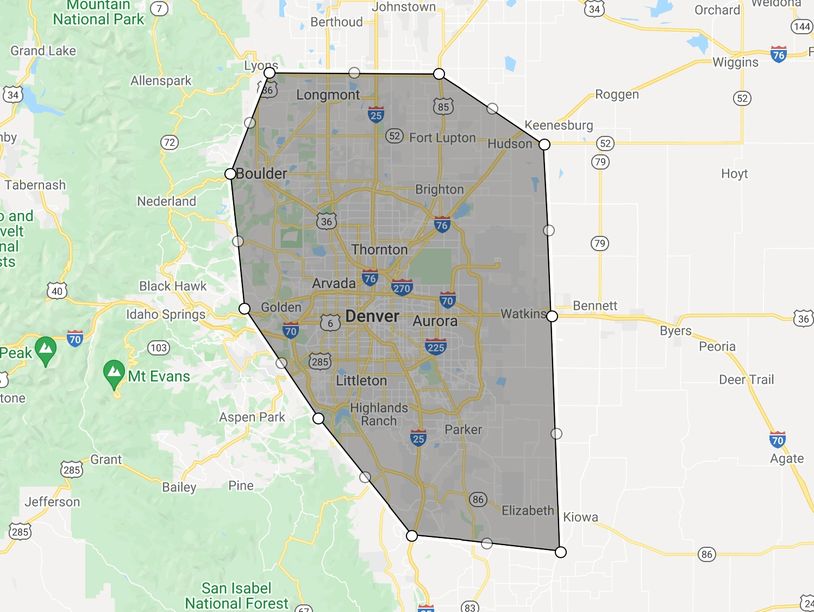 Arvada, Aurora, Boulder, Brighton, Broomfield, Castle Pines, Castle Rock, Centennial, Cherry Creek, Commerce City, Denver, Edgewater, Englewood, Erie, Federal Heights, Firestone, Frederick, Glendale, Golden, Greenwood Village, Henderson, Highlands Ranch, Lafayette, Lakewood, Littleton, Lochbuie, Lone Tree, Longmont, Louisville, Northglenn, Parker, Sheridan, Stapleton, Superior, Thornton, Westminster, Wheat Ridge